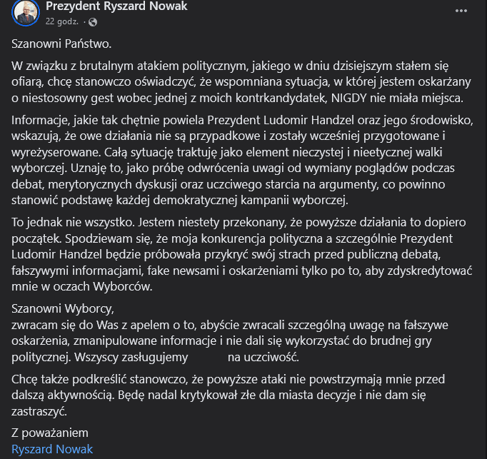 Na to zareagował Ryszard Nowak, który uznał to za „brutalny atak polityczny” i oświadczył, że „wspomniana sytuacja, w której jestem oskarżany o niestosowny gest wobec jednej z moich kontrkandydatek, NIGDY nie miała miejsca” a „informacje, jakie tak chętnie powiela Prezydent Ludomir Handzel oraz jego środowisko, wskazują, że owe działania nie są przypadkowe i zostały wcześniej przygotowane i wyreżyserowane”.