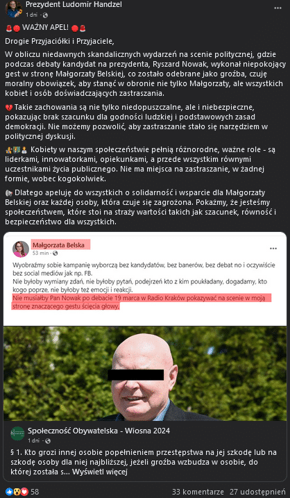 Wpis troll-konta udostępnił niezwłocznie (godzinę później, dwie godziny po wpisie kandydatki) Ludomir Handzel (Koalicja Nowosądecka) kandydat na prezydenta, opatrując go swoim tekstem z nagłówkiem „ważny apel”. Napisał w nim m.in., że „w obliczu niedawnych skandalicznych wydarzeń na scenie politycznej, gdzie podczas debaty kandydat na prezydenta, Ryszard Nowak, wykonał niepokojący gest w stronę Małgorzaty Belskiej, co zostało odebrane jako groźba, czuję moralny obowiązek, aby stanąć w obronie nie tylko Małgorzaty, ale wszystkich kobiet i osób doświadczających zastraszania”. Dodał też, że „takie zachowania są nie tylko niedopuszczalne, ale i niebezpieczne, pokazując brak szacunku dla godności ludzkiej i podstawowych zasad demokracji. Nie możemy pozwolić, aby zastraszanie stało się narzędziem w politycznej dyskusji”.
