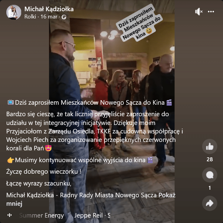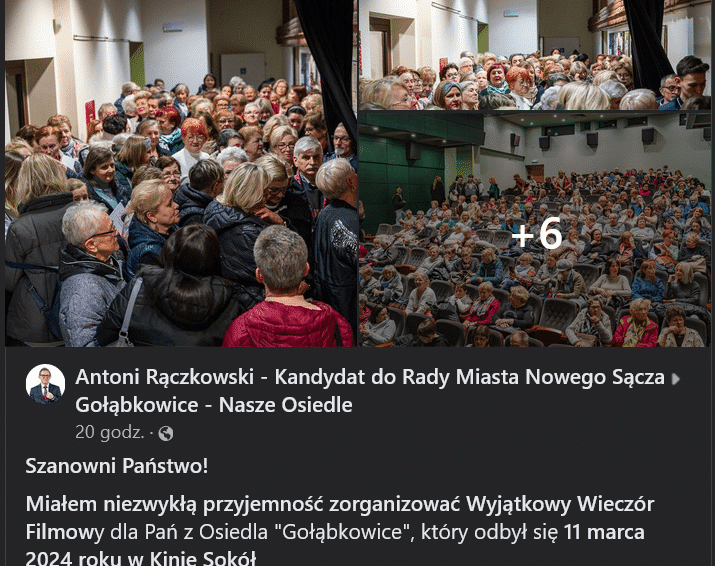 Michał Kądziołka (kandydat do RM z listy PiS) oraz Antoni Rączkowski (także kandydat PiS) zorganizowali niezależnie od siebie wyjścia do kina dla mieszkańców (nie podali, w jaki sposób były sfinansowane bilety). Kądziołka określił to „integracyjną inicjatywą”, a w małej sali kina Sokół obejrzano film „Biała odwaga”. Z kolei Rączkowski napisał, że był to „Wyjątkowy Wieczór Filmowy dla Pań z Osiedla Gołąbkowice” w który wzięło udział około 300 kobiet z osiedla „by świętować Międzynarodowy Dzień Kobiet, oglądając film „Baby Boom czyli Kogel Mogel 5″”.