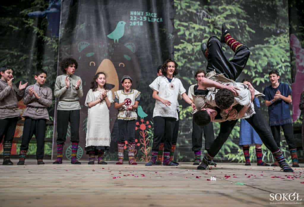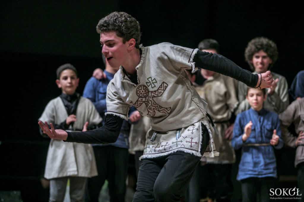I jeszcze jeden instrument, którego Józek nie zapowiedział, więc staje się dla nas niespodzianką. Czibon. Przez scenę cwałują gruzińskie konie, czyli chłopcy w tym charakterystycznym geście uniesionej w górę dłoni i drugiej opuszczonej z tyłu. I zapraszają do tańca dziewczyny… Jedna para, potem druga…