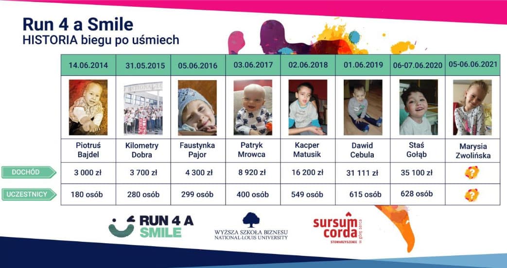 Społeczność akademicka WSB-NLU serdecznie zaprasza na ósmą edycję Run 4 a Smile, czyli biegu po uśmiech. Run 4 a Smile to akcja charytatywna, której głównym punktem jest VIII Międzynarodowy Bieg Charytatywny. W tym roku w dniach 5–6 czerwca 2021 uczestnicy pobiegną po uśmiech 5-letniej Marysi Zwolińskiej, u której u której na początku czerwca 2020 r. lekarze zdiagnozowali ostrą białaczkę limfoblastyczną. Cały dochód z akcji zostanie przeznaczony na kosztowne leczenie Marysi, będącej podopieczną Stowarzyszenia Sursum Corda.