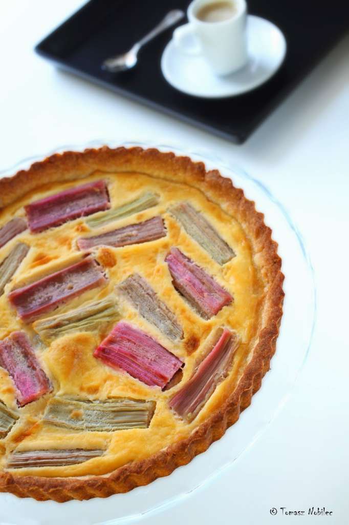 Nadzienie – Rabarbar myjemy obieramy i kroimy na 5 cm paski. Zasypujemy cukrem i odstawimy na godzinę.Żółtka i jajko mieszamy ze śmietanką, cukrem waniliowym. Na podpieczony spód wykładamy rabarbar i zalewamy go masa jajeczno- śmietankową. Wierzch posypujemy cukrem brązowym. Wkładamy do piekarnika na około 30 minut.
