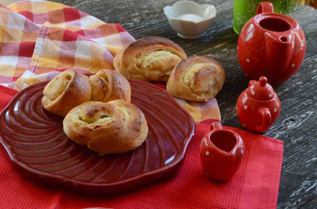 3. Ser mieszamy z cukrem, wanilią i żółtkami. Wyrośnięte ciasto wałkujemy na duży prostokąt, smarujemy masą serową i zwijamy od dłuższego boku, jak roladę. Powstały wałek kroimy na 2-3 cm plastry i układamy drożdżówki na wyłożonej papierem do pieczenia blaszce. Zostawiamy na kolejne pół godziny do wyrośnięcia.
