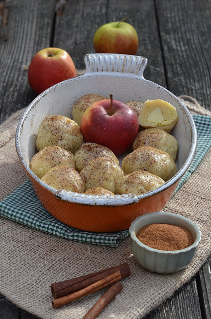 1. Ziemniaki ugotować, wystudzić i przepuścić przez maszynkę, dodać jajo, sól i mąkę, zagnieść ciasto. Obrać jabłka, pokroić na mniejsze kawałki. Ciasto zrolować w wałek na stolnicy oprószonej mąką, pokroić na małe kawałki, każdy kawałek nadziewać jabłkiem i formować okrągły kształt knedla.