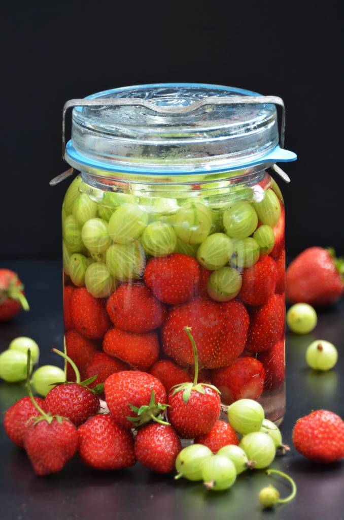 1. Truskawki i agrest dokładnie płuczemy pod zimną bieżącą wodą, obieramy z szypułek i ogonków. Wypełniamy słoiki do 3/4 wysokości ze zdecydowaną przewagą truskawek. Wsypujemy cukier, u mnie 1 kg cukru wystarcza na 9-10 litrowych słoików, zalewamy przegotowaną wodą, zakręcamy i pasteryzujemy ok. 15-20 minut.