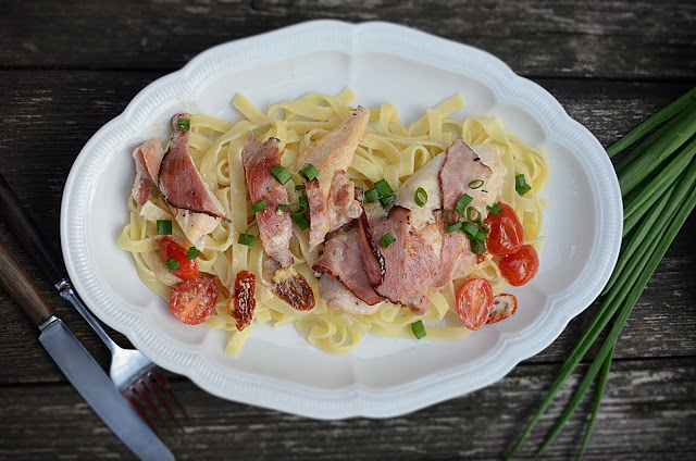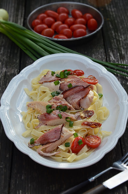 Kurczak niekoniecznie tradycyjny, soczyste filety zapiekane w plastrach bekonu, duszone w świeżych i suszonych pomidorach, podawane na makaronowych tagliatellach spowodowały, że obiad znikł tak szybko, że z trudem jedną porcję pozwolono mi sfotografować dla Was :).