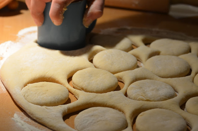 3. Po wyrośnięciu wyjmujemy ciasto, spłaszczamy ręką na grubość ok 2 cm i wycinany szklanką kółka, każde nadziewamy twardą marmoladą i bardzo dokładnie sklejamy, układamy je na stolnicy posypanej mąką i zostawiamy do ponownego wyrośnięcia, miejsce w którym były zlepiane dajemy od spodu.