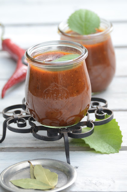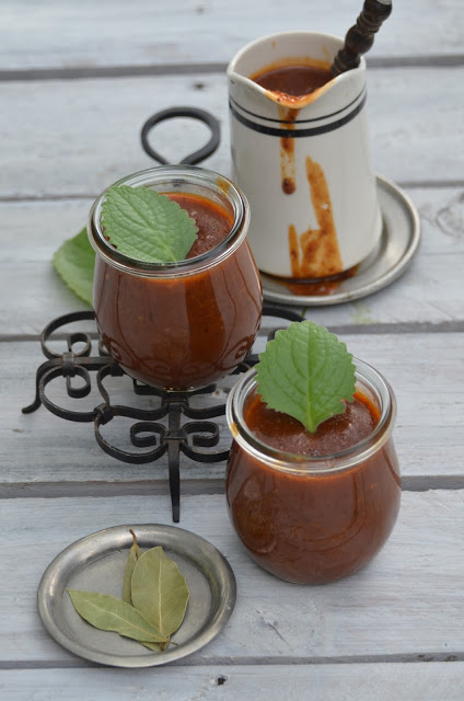 2. Następnie dodajemy resztę składników, doprowadzamy do wrzenia, gotujemy razem ok. 5-7 minut, wyjmujemy liście laurowe, goździki i ziele angielskie, resztę składników blendujemy na gładką masę. Po koniec doprawiamy solą i pieprzem, możemy również zagęścić skrobią Kuzu. Gorący sos przelewamy do słoików i zakręcamy.