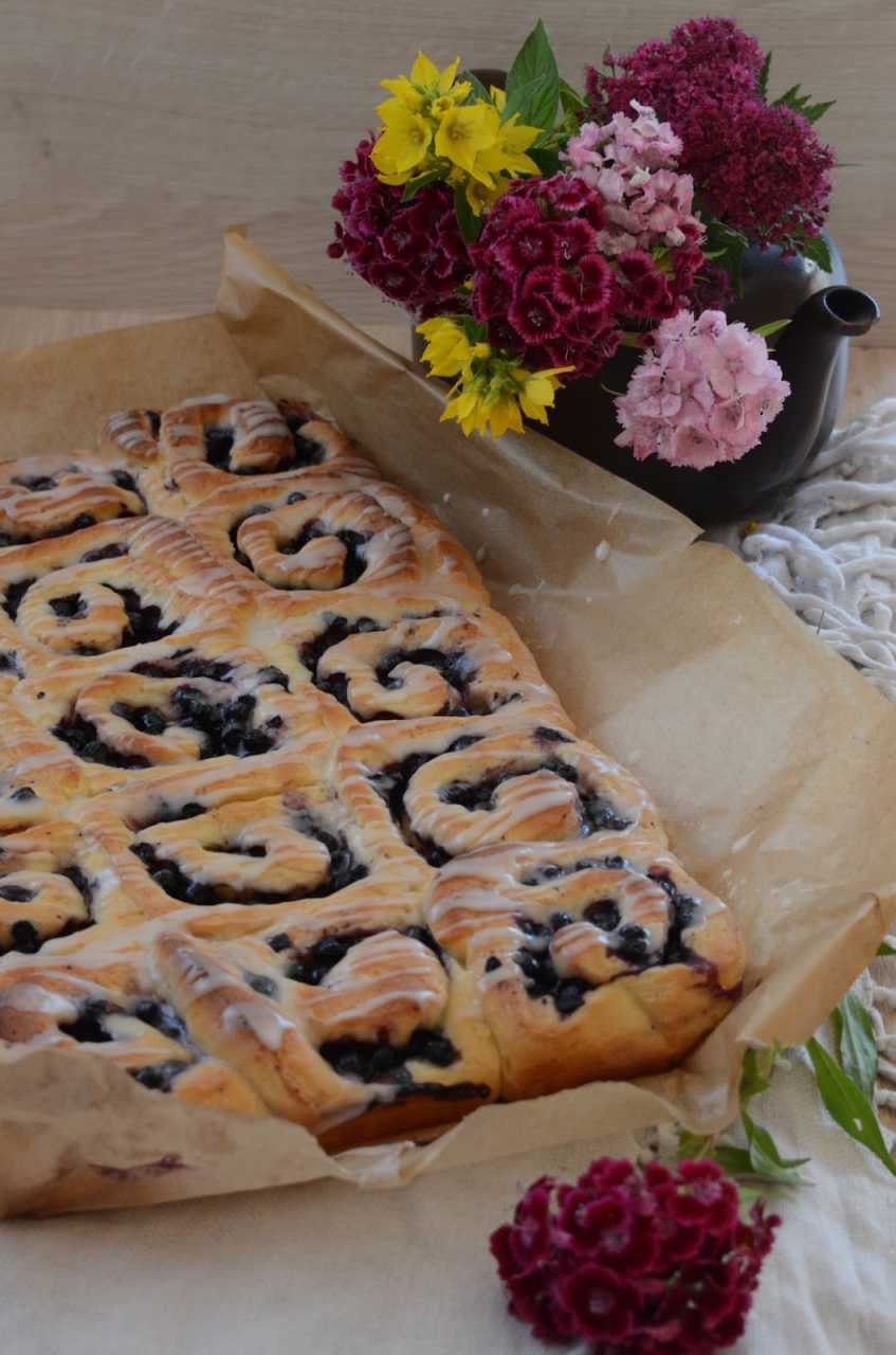 2. Roztopionym masłem z cukrem smarujemy całą powierzchnię ciasta, a następnie wysypujemy równomiernie jagody. Ciasto zwijamy wzdłuż dłuższego boku jak na roladę, kroimy na ok. 2 cm plastry i układamy na foremkach wyłożonych papierem do pieczenia w małych odstępach. Formę zostawiamy na około 30 minut by ciasto urosło, a następnie wkładamy do piekarnika nagrzanego do 200 C i pieczemy około 35 minut, aż się zarumieni.