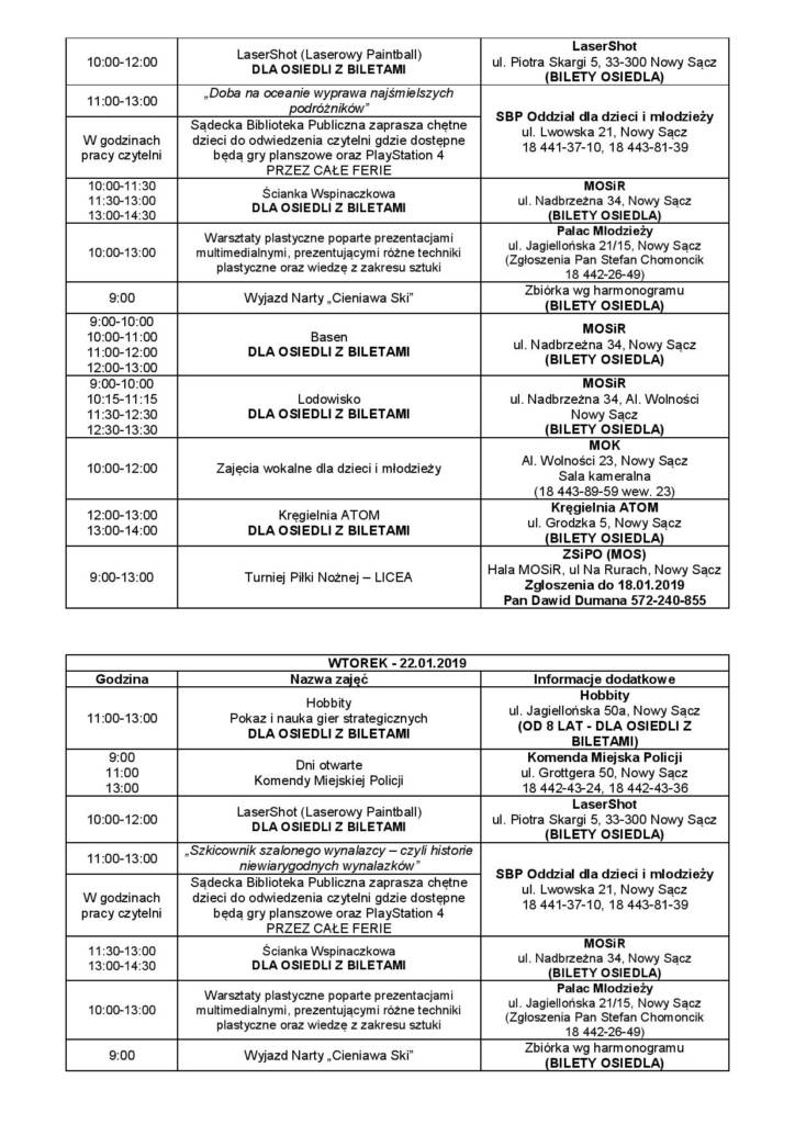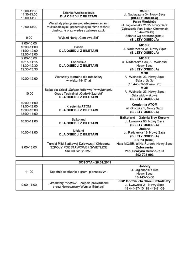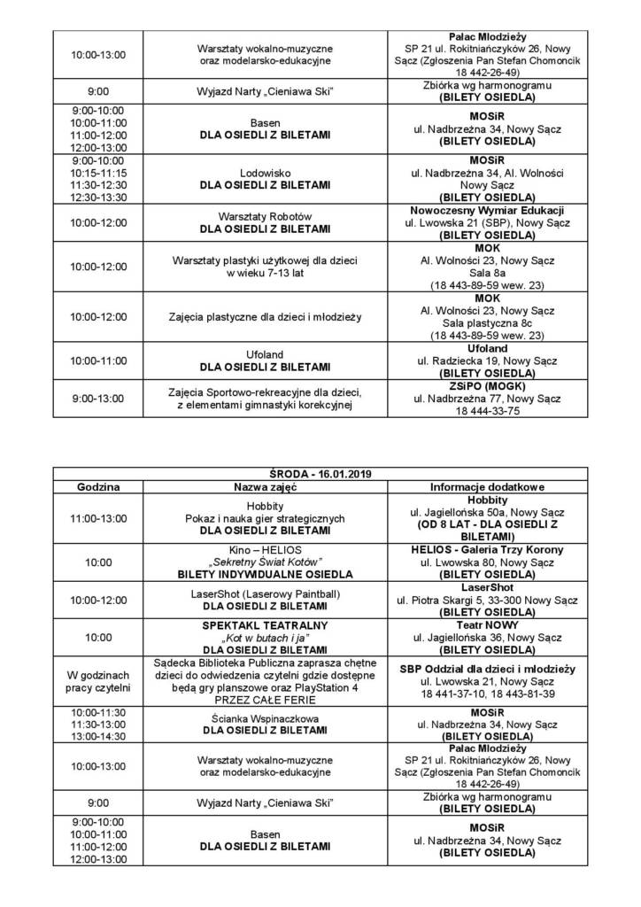 – Na każdy dzień przygotowaliśmy dla dzieci i młodzieży kilkanaście różnych zajęć i imprez równolegle – od wyjazdów poprzez zajęcia na terenie miasta. Chcę zaznaczyć, że są to zajęcia absolutnie bezpłatne, są finansowane przez Urząd Miasta Nowego Sącza – informuje Agnieszka Szeliga z Wydziału Zdrowia i Opieki Społecznej Urzędu Miasta i dodaje: – W ramach tych zajęć zapewniamy dzieciom opiekę, którą będą sprawować pracownicy szkół i placówek oświatowych oraz pracownicy świetlic środowiskowych. Podczas wyjazdów dzieci i młodzież będą ubezpieczone oraz dostaną ciepły posiłek.