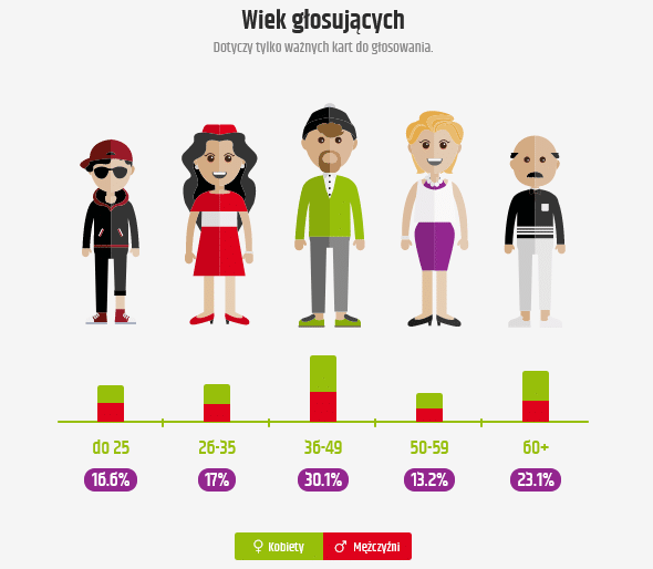 Więcej ważnych głosów oddały kobiety (55%). Natomiast według wieku głosujących najwięcej – 30,1% ważnych głosów – oddały osoby między 36 a 49 rokiem życia.