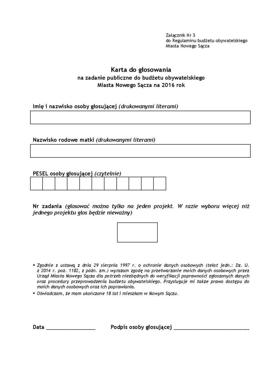 Głosować można tylko jeden raz na tylko jeden wybrany przez siebie projekt (tutaj znajdziesz pełną listę 37 projektów dopuszczonych do głosowania). Aby głosować należy mieć ukończone 18 lat i być zameldowanym (stale lub czasowo) na terenie Nowego Sącza.