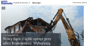 GAZETA KRAKOWSKA "W czwartek o godz. 11 przy ulicy Krakowskiej w Nowym Sączu rozpoczęło się wyburzanie kamienicy. Do akcji wkroczył ciężki sprzęt. Robotnicy zaczęli...