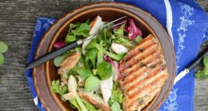 Pyszny obiad w 15 minut? Oczywiście! Grillowany kurczak w sosie sojowym z dużą ilością sałaty w czosnkowym dressingu poleca się na obiady i kolacje.