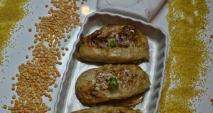 Bezmięsna alternatywa gołąbków. Kasza jaglana w połączeniu z żółtym grochem fantastycznie się komponuje, do tego zioła i blanszowana cebulka i można zasiadać do obiadu.