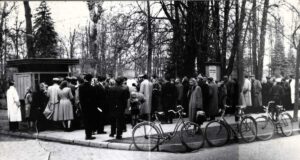 Po raz pierwszy publikowana fotografia Mieczysława Jarończyka, opisana na odwrocie jak "Pierwszy Lajkonik w Nowym Sączu". Chodzi o kolejkę chętnych do wysłania kuponu Krakowskiej...
