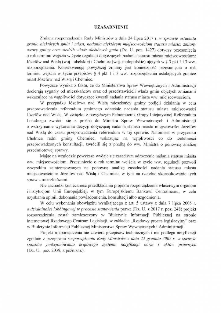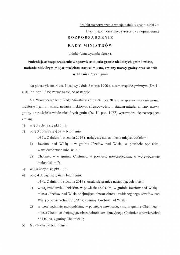 W czwartek Rządowe Centrum Legislacji opublikowało projekt Rozporządzenia Rady Ministrów, przesuwający o rok wejście w życie aktualnie obowiązującego rozporządzenia o nadaniu Chełmcowi statusu miasta z dniem 1 stycznia 2018.