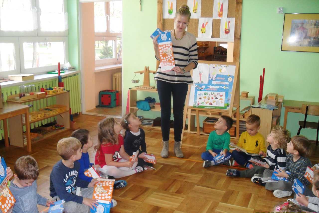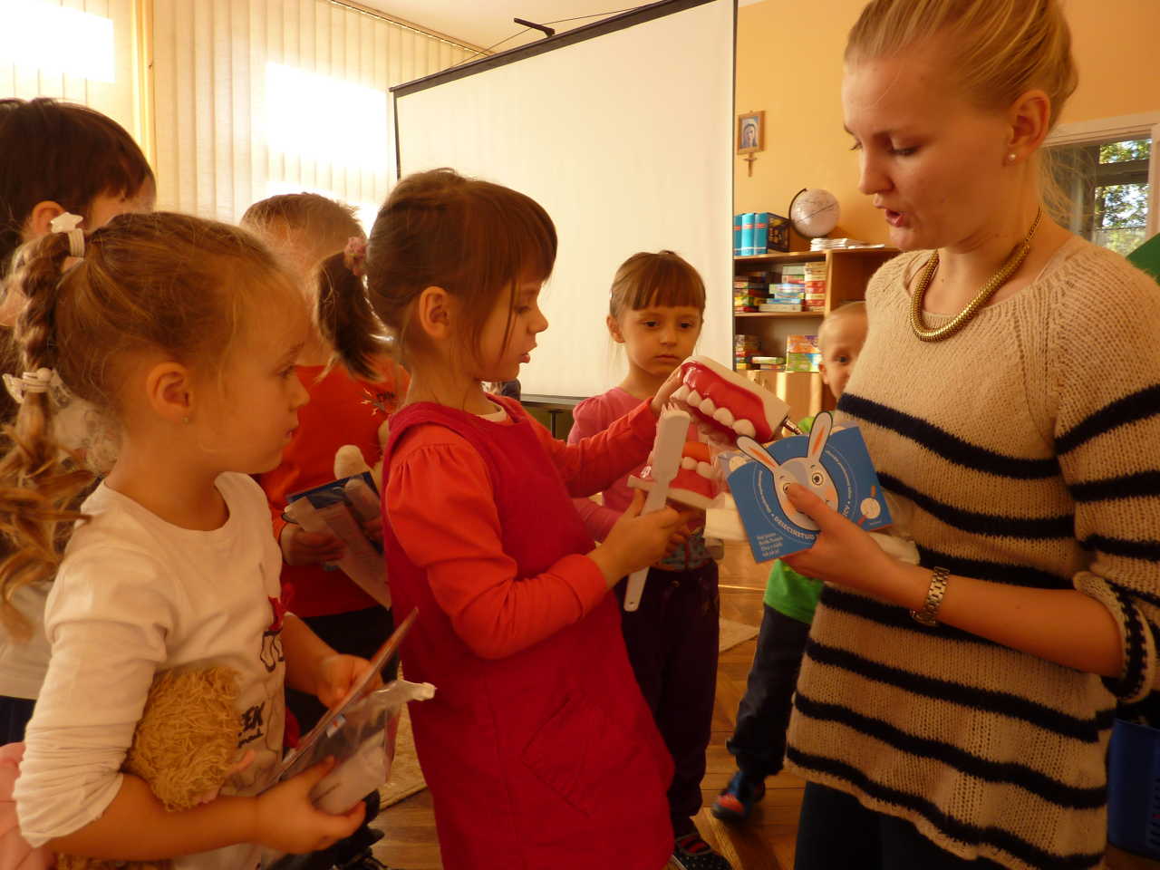 W ramach profilaktyki uczącej podstaw higieny jamy ustnej, dzieci z naszego przedszkola uczestniczyły w zajęciach z edukatorami, którzy prezentowali w jaki sposób prawidłowo szczotkować i dbać o zęby. Dzieci dowiedziały się jak na co dzień, łącząc edukację z zabawą, dbać o higienę jamy ustnej, a w działaniach tych wpierał je Królik Pampiś –maskotka projektu, która w odpowiednio metodycznie dopracowanym filmie edukacyjnym opowiadała, jak pielęgnować zęby samodzielnie i z pomocą rodziców lub specjalistów. Na zakończenie spotkania każde z dzieci biorące udział w projekcie otrzymało swój własny zestaw szczoteczki oraz pasty do zębów.