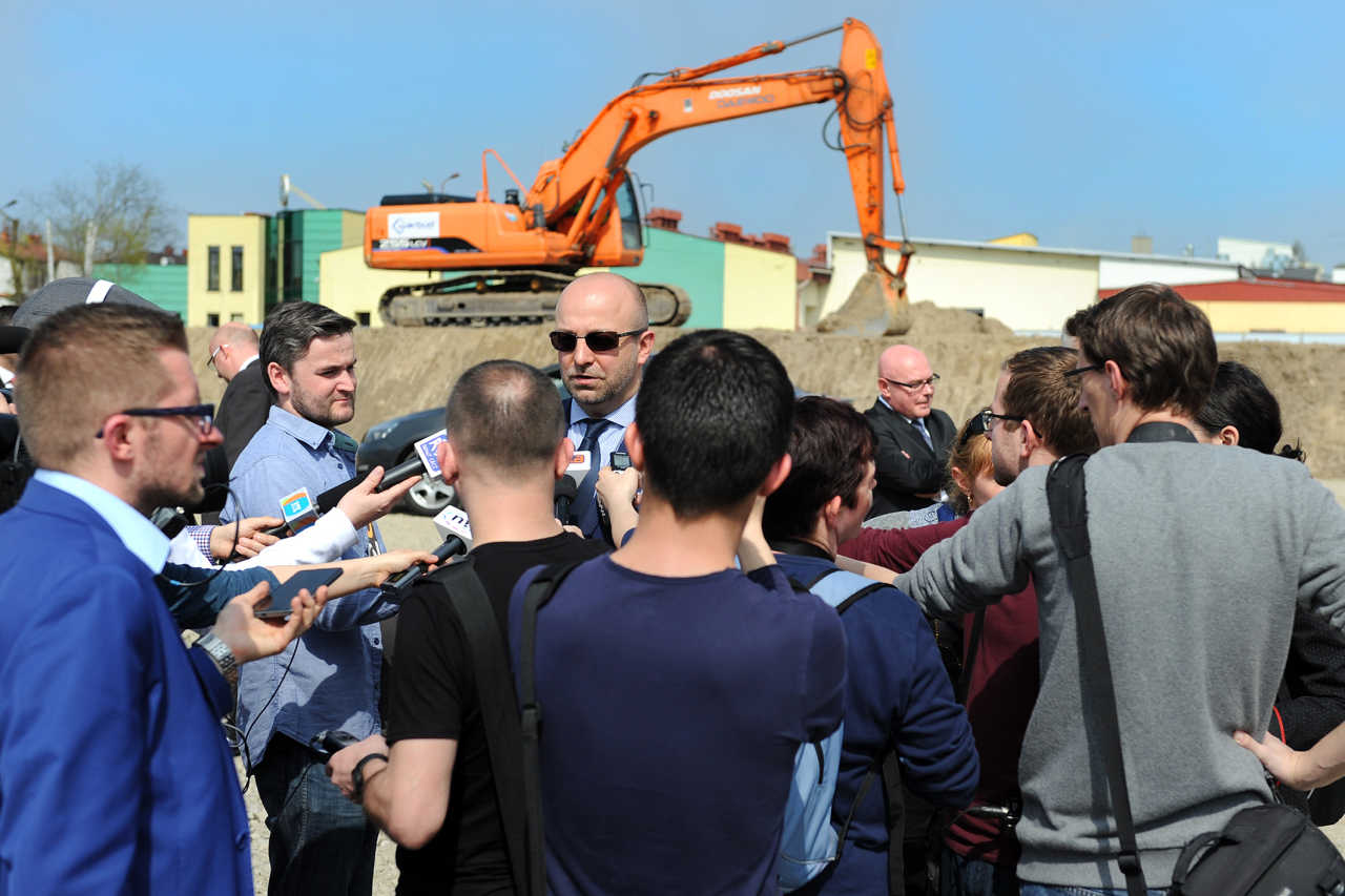 Czwartek, 7 kwietnia 2016, godz. 13:50. Ulica Grunwaldzka. Podsekretarz Stanu w Ministerstwie Sprawiedliwości Łukasz Piebiak (w okularach w środku) w otoczeniu dziennikarzy na uroczystym rozpoczęciu budowy nowego Sądu Rejonowego. Fot. Janusz Miczek / Twój Sącz