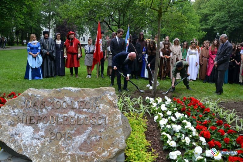 Środa, 16 maja 2018, godz. 10:21. Planty. Sadzenie Dębu 100-lecia Niepodległości. Drzewo przekazał Prezydent RP Andrzej Duda w czasie swojego pobytu w Nowym Sączu 2 marca 2018 roku. Był to dar dla społeczności I Gimnazjum i Liceum Ogólnokształcącego imienia Jana Długosza z okazji jubileuszu 200-lecia utworzenia szkoły. Fot. UMNS