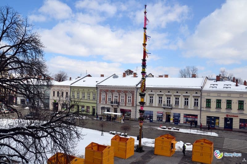 Środa, 21 marca 2018, godz. 14:25. Rynek. Stoi już palma wielkanocna. Ma niemal 25 m wysokości, zdobi ją 5 tysięcy kwiatów, 600 metrów wstążki oraz bazie wierzby, gałęzie sosny i bukszpanu. Wykonana jest z kłody jodłowej przy użyciu 250 kg wikliny i 40 kg drutu oraz gwoździ. Wokół stawiane są stragany kiermaszu wielkanocnego. Fot. UMNS