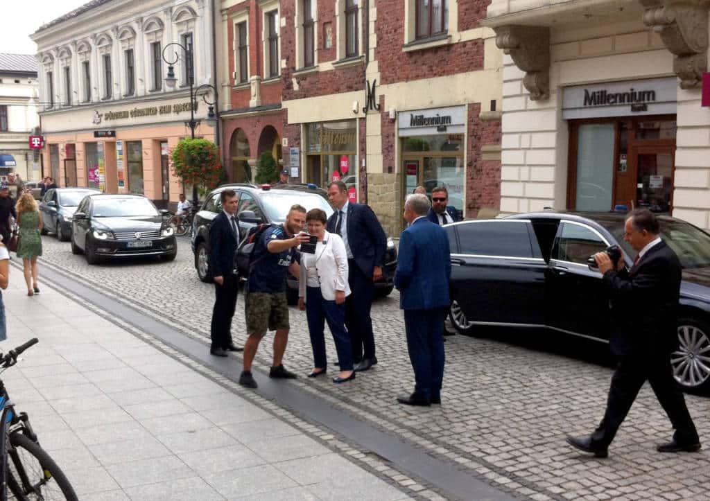 Piątek, 24 sierpnia 2018, godz. 15:34. Ulica Jagiellońska. Przebywająca w mieście z powodu kampanii wyborczej wicepremier Beata Szydło z przypadkowym przechodniem robiącym z nią selfie. Z tyłu trzy limuzyny rządowe na zamkniętym dla ruchu deptaku. Fot. BP / Twój Sącz