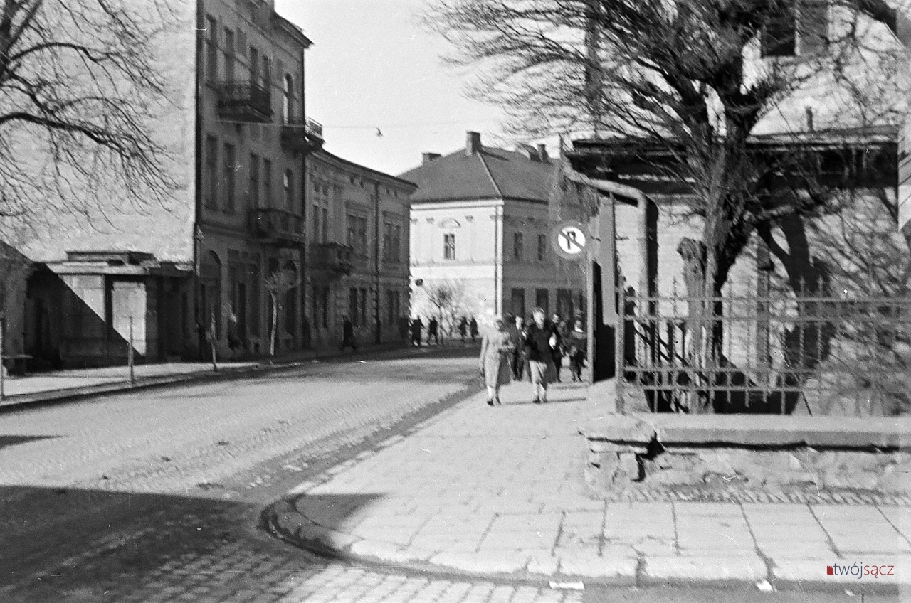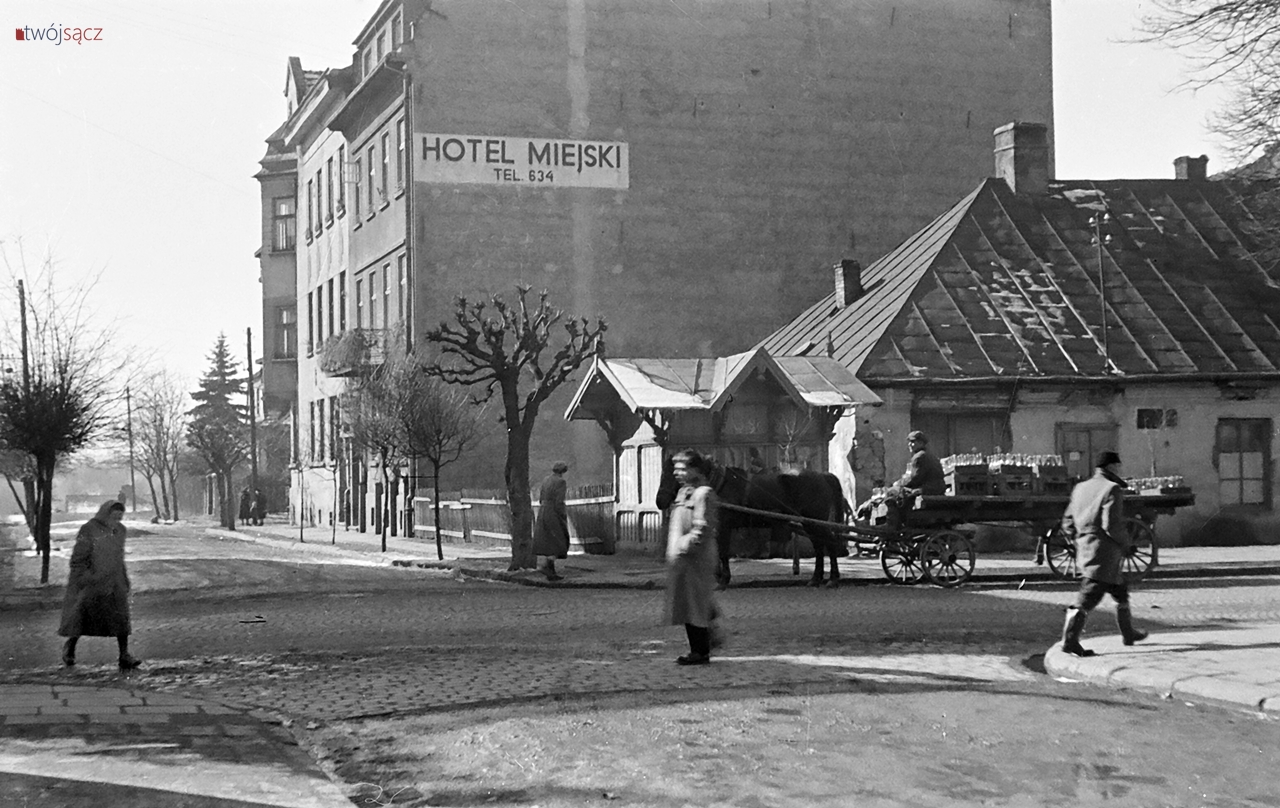 Nowy Sącz lat pięćdziesiątych. Skrzyżowanie ulicy Jagiellońskiej i Narutowicza. Za wozem konnym dożywający swych dni XIX-wieczny dom z adresem Jagiellońska 24 (dom zniknie na przełomie lat 50. i 60., adres przejmie znacznie później nowy budynek usługowy przylegający do wcześniejszej kamienicy z nr 22).