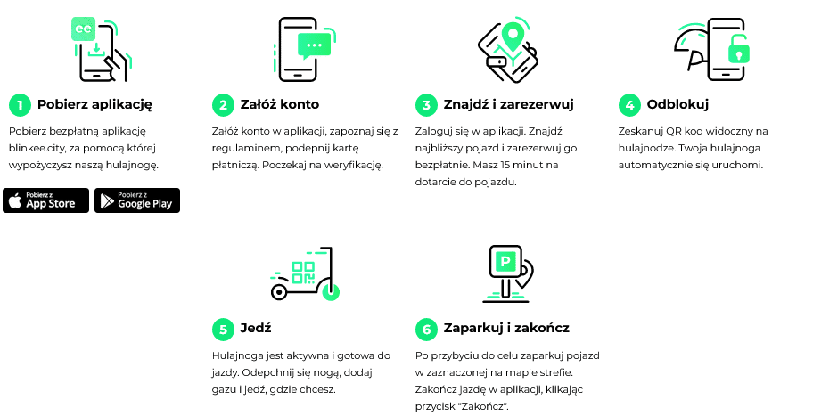 Aby skorzystać z hulajnogi należy najpierw pobrać aplikację blinkee.city i założyć konto oraz skojarzyć z nim kartę płatniczą lub dokonać przedpłaty dowolnej sumy. Aby skorzystać ze zniżki dla posiadaczy Karty Nowosądeczanina należy przesłać także zdjęcie Karty. W aplikacji znajdziemy najbliższy pojazd i zarezerwujemy go bezpłatnie na najbliższe 15 minut (czas na ewentualne dojście do hulajnogi). Potem należy zeskanować kod QR znajdujący się na hulajnodze, co odblokuje pojazd. Gdy nie chcemy już korzystać z usługi, wystarczy zaparkować hulajnogę w zaznaczonej na mapce w aplikacji strefie (większość terenu Nowego Sącza). Twórcy aplikacji apelują, żeby nie parkować hulajnóg na przejściach dla pieszych, ścieżkach rowerowych, trawnikach czy terenach zamkniętych. W Nowym Sączu nie wolno będzie także zostawiać hulajnóg m.in. na miejscach strefy płatnego parkowania.