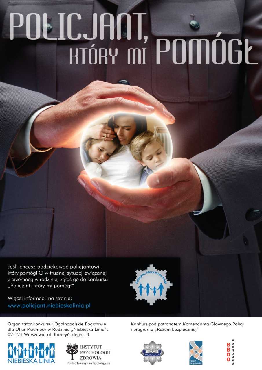 „Niebieska Linia” już po raz IX organizuje konkurs „Policjant, który mi pomógł”. Każdy kto chciałby podziękować policjantowi, który pomógł mu w trudnej sytuacji związanej z przemocą w rodzinie, może zgłosić go do konkursu. Celem konkursu jest podkreślenie roli policjantów w przeciwdziałaniu przemocy w rodzinie. Wsparcie policjantów podejmujących wzorowe działania i osobiście zaangażowanych w pomoc osobom krzywdzonym oraz promowanie postaw i umiejętności dobrze służących ochronie ofiar przemocy w rodzinie. Inicjatywę honorowym patronatem objął Komendant Główny Policji.