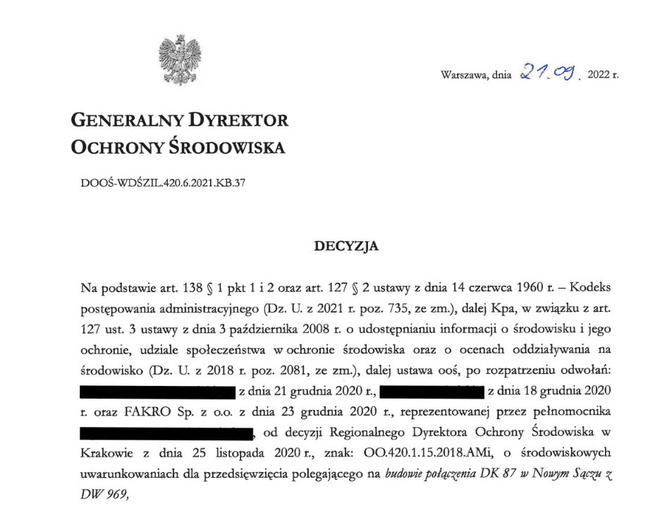 Generalny Dyrektor Ochrony Środowiska po rozpatrzeniu odwołań uchylił w kilkunastu punktach decyzję Regionalnego Dyrektora Ochrony Środowiska w Krakowie z dnia 25 listopada 2020 r. o środowiskowych uwarunkowaniach dla przedsięwzięcia pn.: „budowa połączenia DK 87 w Nowym Sączu z DW 969” ale w pozostałym zakresie utrzymał ją w mocy. Oznacza to, że preferowany przez władze Nowego Sącza i okoliczne samorządy wariant „C” przebiegi nowej drogi w końcu ma ostateczną decyzję środowiskową w administracyjnym toku instancji czyli nie przysługuje od niej kolejne odwołanie (choć możliwa jest jeszcze skarga do sądu pod zarzutem niezgodności z prawem).