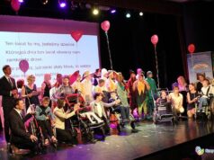 Następnie zaprezentowano bieżącą działalność Stowarzyszenia, które wspiera osoby z niepełnosprawnością intelektualną, ruchową, autystyczne i z zespołami genetycznymi. W jej zakres wchodzi m.in. organizacja wycieczek edukacyjnych, imprez kulturalnych i sportowych, sympozjów szkoleniowych, konsultacji i zajęć ze specjalistami oraz doposażenie ośrodka w sprzęt rehabilitacyjny i dydaktyczny. Przedstawiono projekty realizowane w ostatnich kilku latach i podsumowano aktualnie kończące się zadanie pt: „Mała pracowania ceramiczna”, którego uczestnicy otrzymali z rąk pani Urszuli Gawrońskiej – dyrektor Specjalnego Ośrodka Szkolno – Wychowawczego pamiątkowe dyplomy. Spotkanie uświetnił występ chóru Scherzo pod dyrygenturą pana Andrzeja Citaka. Na zakończenie nastąpiło uroczyste pokrojenie tęczowego tortu.
