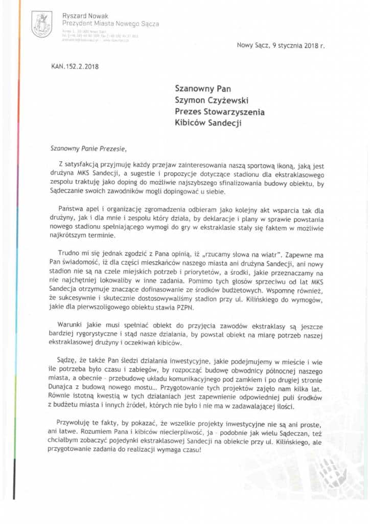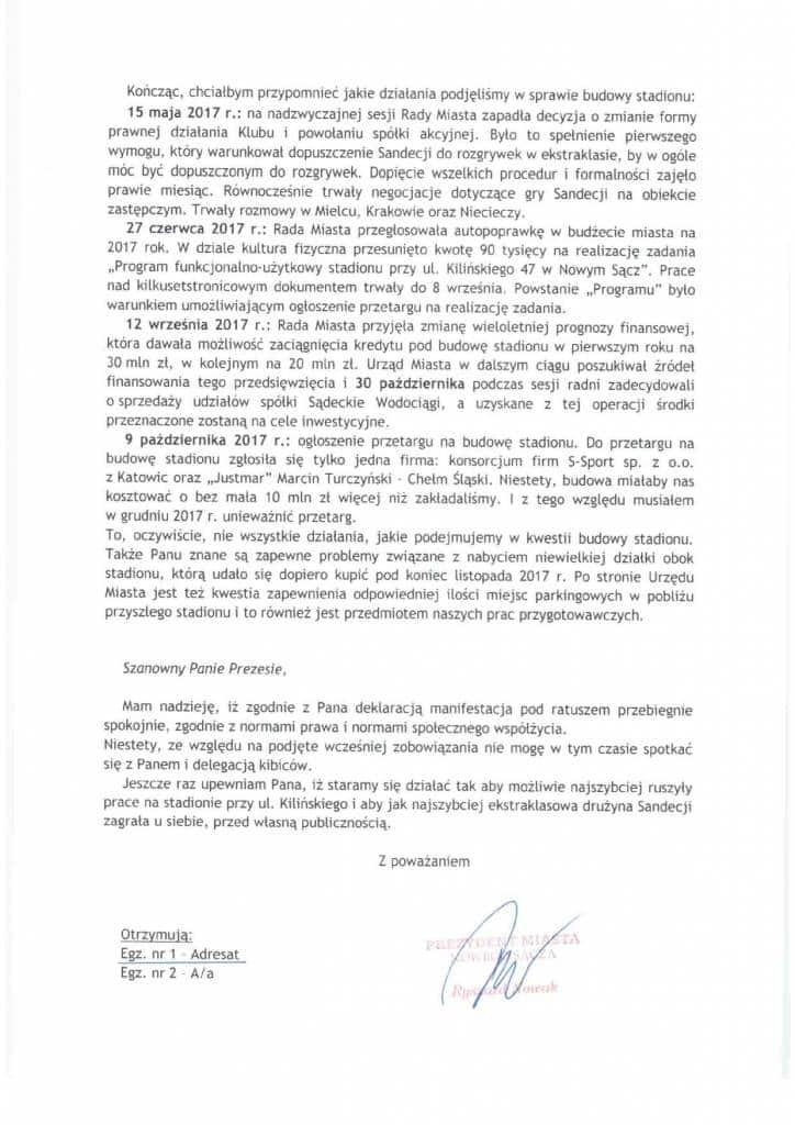 Nikt z władz miasta nie spotkał się z demonstrantami. Za to kilka dni wcześniej Prezydent Nowego Sącza Ryszard Nowak wystosował list do Stowarzyszenia Kibiców Sandecji (całość poniżej).
