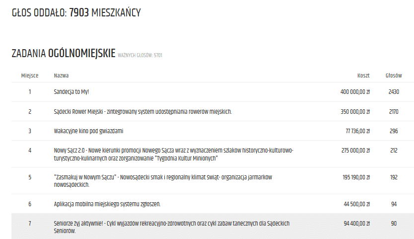 Niemal 8 tysięcy mieszkańców Nowego Sącza wzięło udział w zakończonym o północy głosowaniu na projekty czwartej edycji budżetu obywatelskiego miasta. Wśród pomysłów ogólnomiejskich zwyciężyło budzące sporo kontrowersji zadanie „Sandecja to My!”. W dzielnicowych projektach wygrały cztery projekty wykorzystujące maksymalną, dopuszczalną kwotę – po 400 tys. zł każdy.