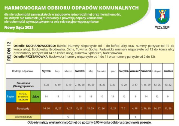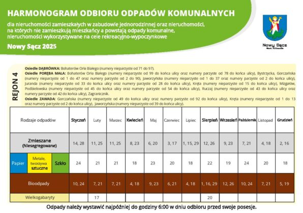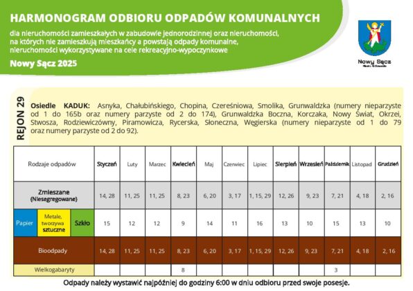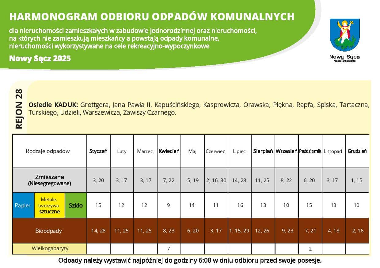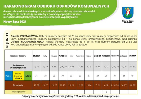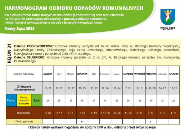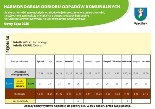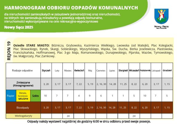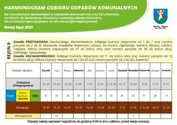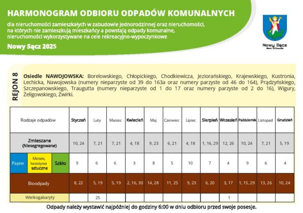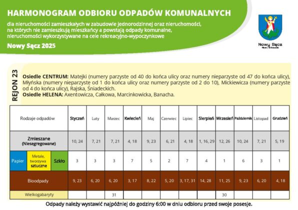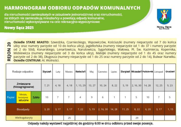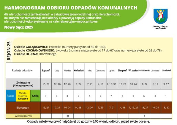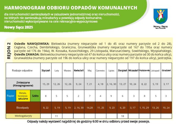Harmonogram odbioru odpadów 2025 Nowy Sącz: