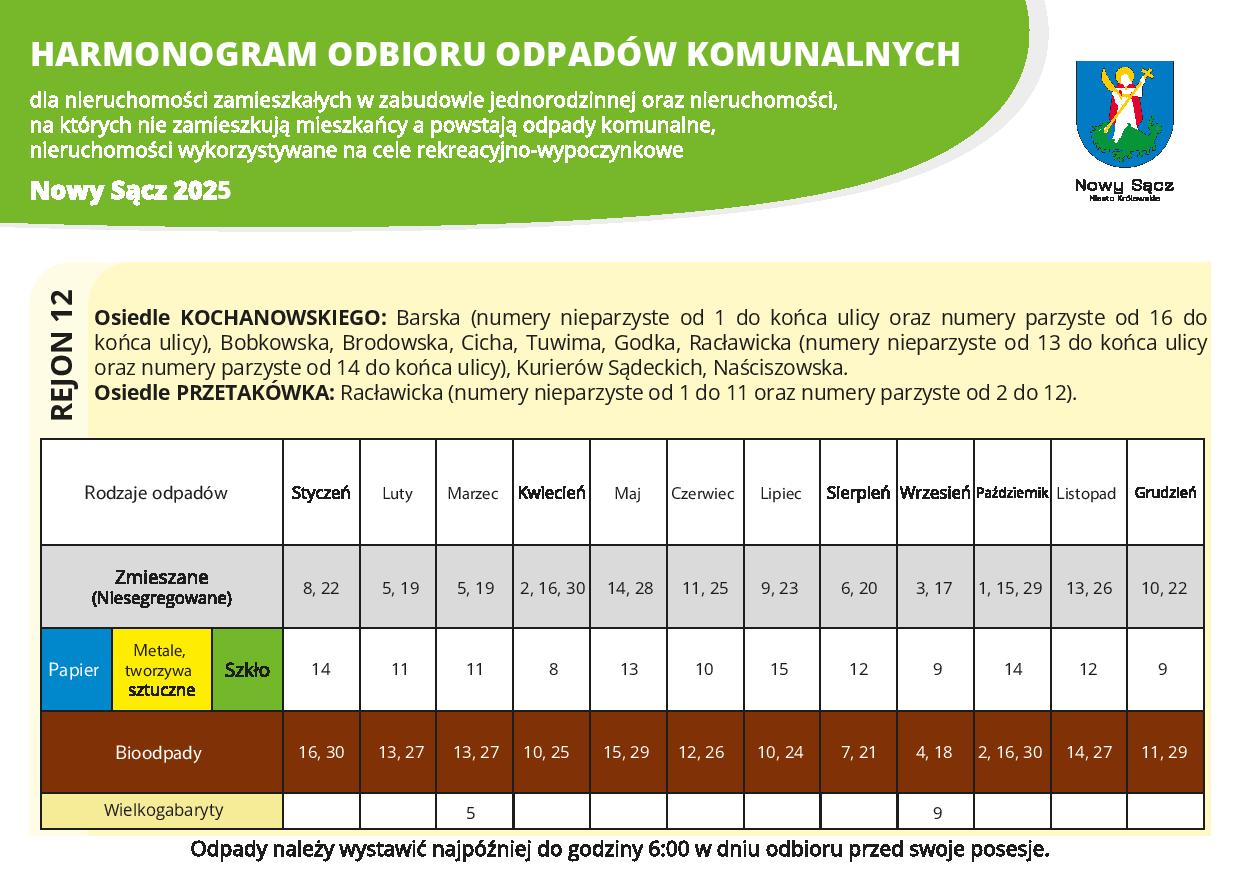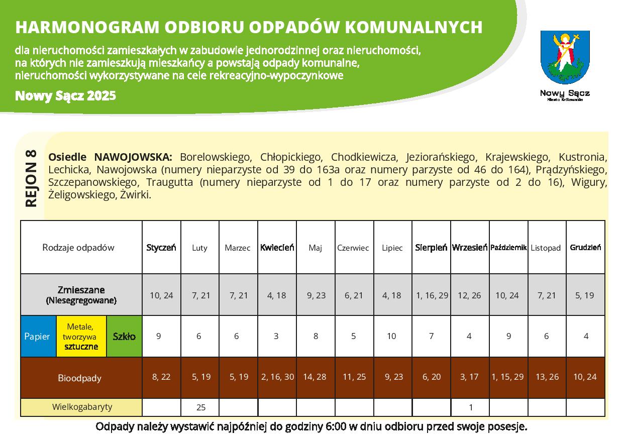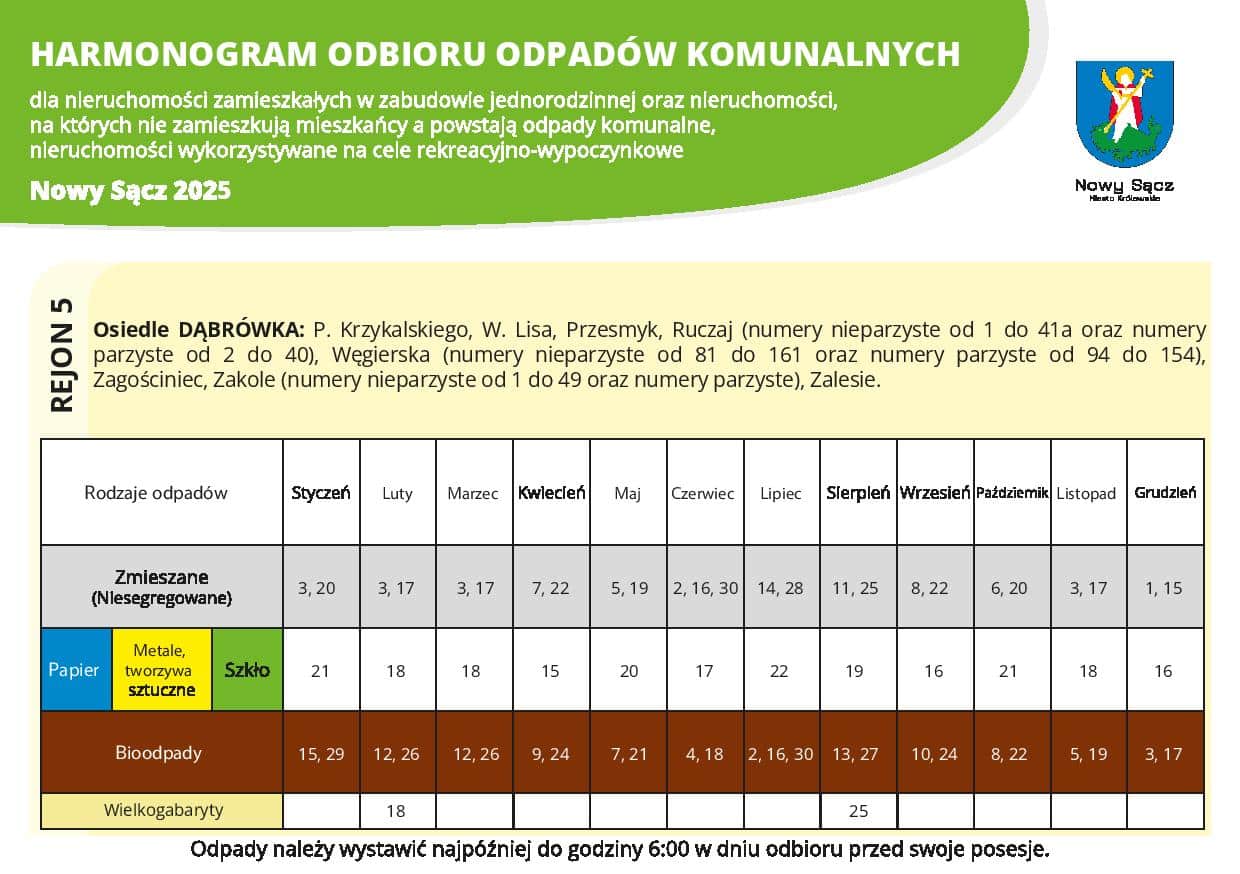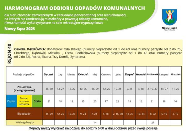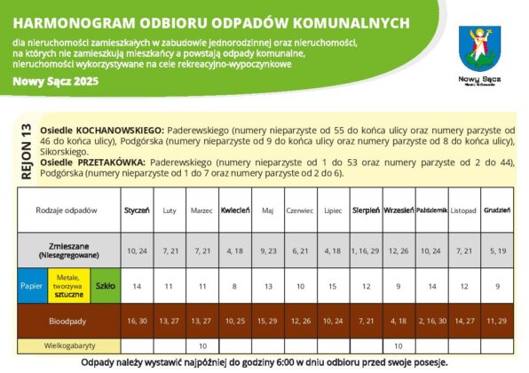 Wydział Komunalnej Obsługi Miasta Urzędu Miasta Nowego Sącza opublikował harmonogram odbioru odpadów komunalnych na 2025 rok. Miasto podzielone jest na 40 rejonów i daty odbioru poszczególnych frakcji w danym rejonie można sprawdzić poniżej.