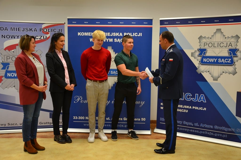 Adrian i Łukasz – uczniowie Zespołu Szkół nr 1 w Nowym Sączu, którzy odebrali złodziejowi plecak i zwrócili go okradzionej kobiecie, otrzymali podziękowania i listy gratulacyjne z rąk Komendanta Miejskiego Policji w Nowym Sączu.