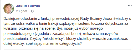 Przykro słuchać jak parę godzin po zdradzie jeden z nikczemników publicznie ubolewał nad tym, co spotkało Bożenę Jawor. Obłuda, obłuda, obłuda… – tak z kolei napisał zastępca prezydenta Nowego Sącza Jerzy Gwiżdż. Nie wiadomo o kim, bo nazwiska nie padają, ale Gwiżdż pisze także o „sześciu zdradzieckich radnych” oraz sprzeniewierzeniu się „lojalności i zwykłej ludzkiej uczciwości”. Zobaczcie cały wpis wiceprezydenta: