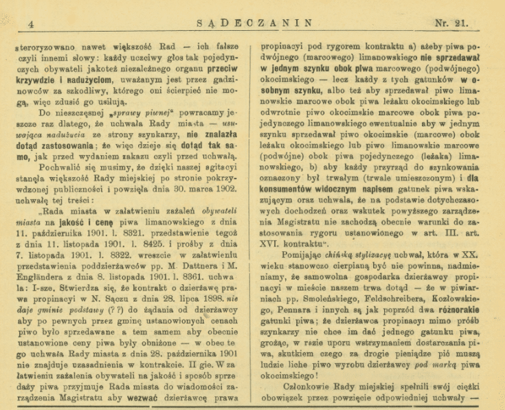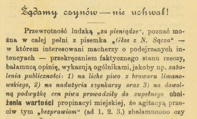 Nowy Sącz ma daleko idące tradycje browarnicze, po których do dziś pozostały jedynie wzmianki. Miasto długo posiadało własny browar, podobnie bogatsi ziemianie żyjący na obrzeżach miasta. Ale na początku XX wieku jakość trunku była kwestionowana, więc Rajcy postanowili przyjrzeć się sprawie…