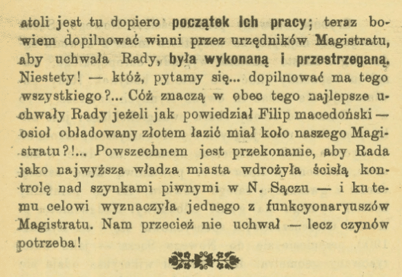 Tymczasem dla nowosądeckich Radnych alkoholizm był sporym problemem społecznym, ale również i dochodem. Sprawa sprzedaży napojów wyskokowych od zawsze żywo interesowała władze miasta. Nie ma co się dziwić, bowiem prawo propinacji – czyli sprzedaży alkoholu – to był spory dochód do budżetu. Tak rozpijaczony był Nowy Sącz, ten sam pełen sodalicji, świętych stowarzyszeń i władz klęczących przed ołtarzami kościołów…
