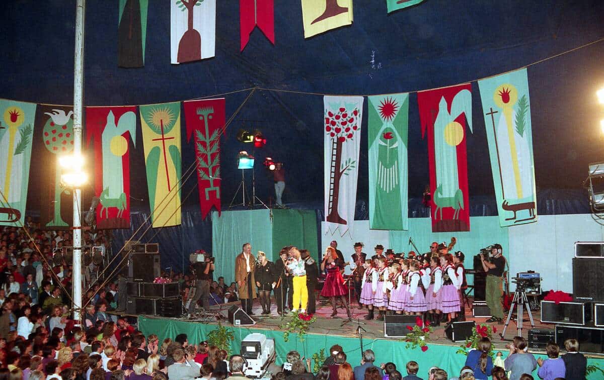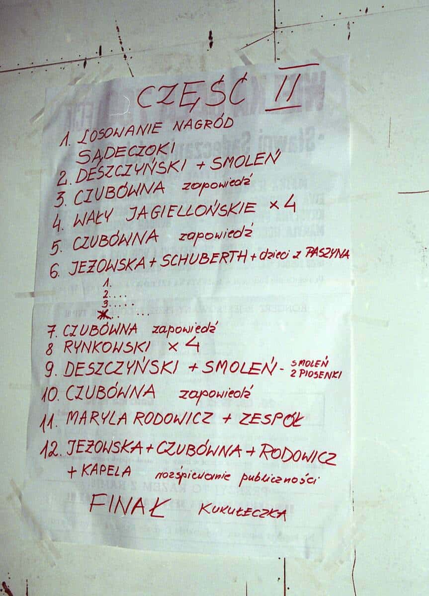 Widownia namiotu była szczelnie wypełniona, całość rejestrowała „Dwójka” TVP a artyści dali występy entuzjastycznie przyjmowane przez publiczność. Dzięki fotografiom Sylwestra Adamczyka możemy przenieść się również za kulisy wydarzenia, gdzie zobaczymy, podobnie jak na widowni, wiele znajomych twarzy – nie tylko samych artystów ale i postaci związane wówczas z sądecką kulturą.