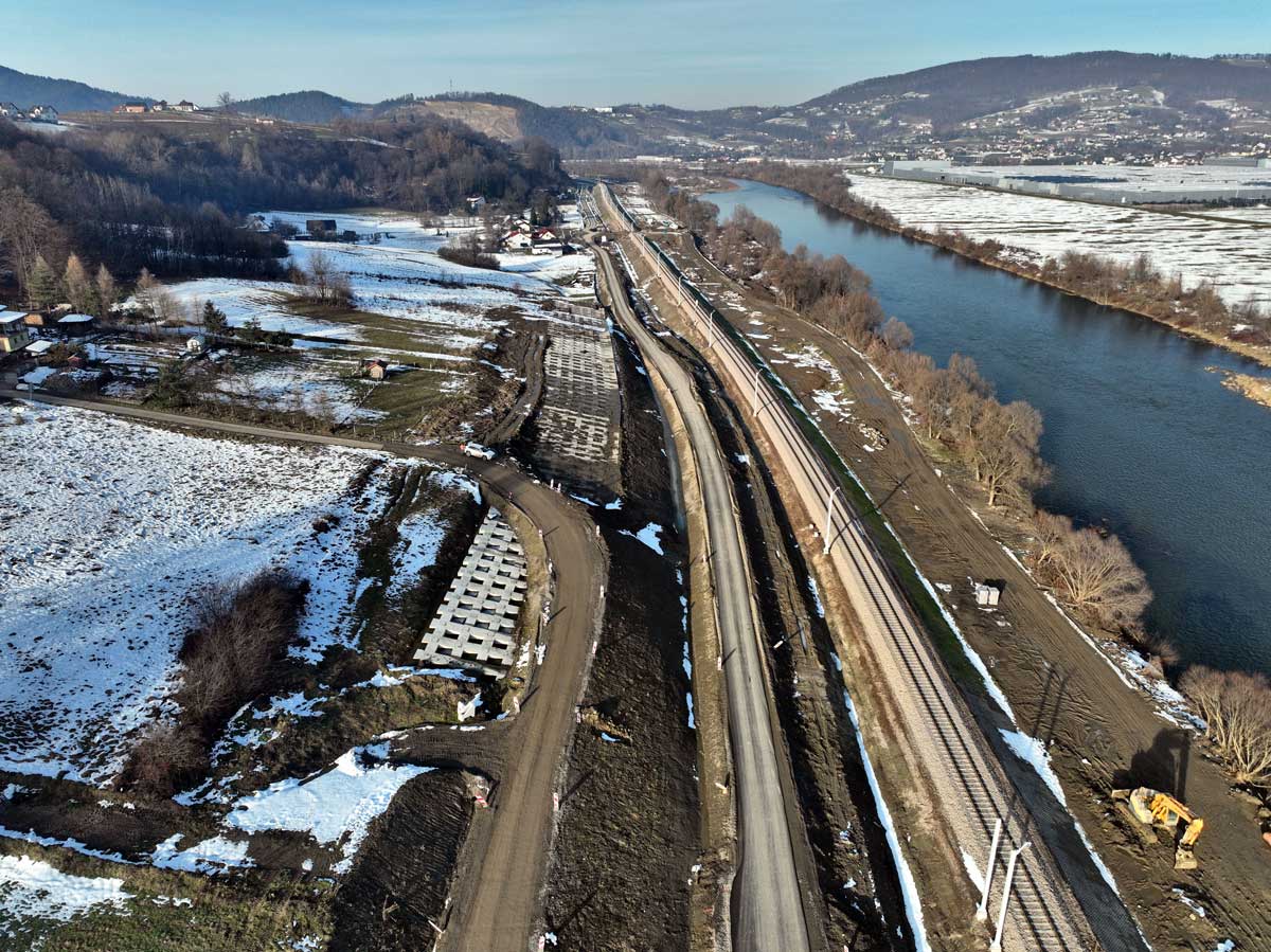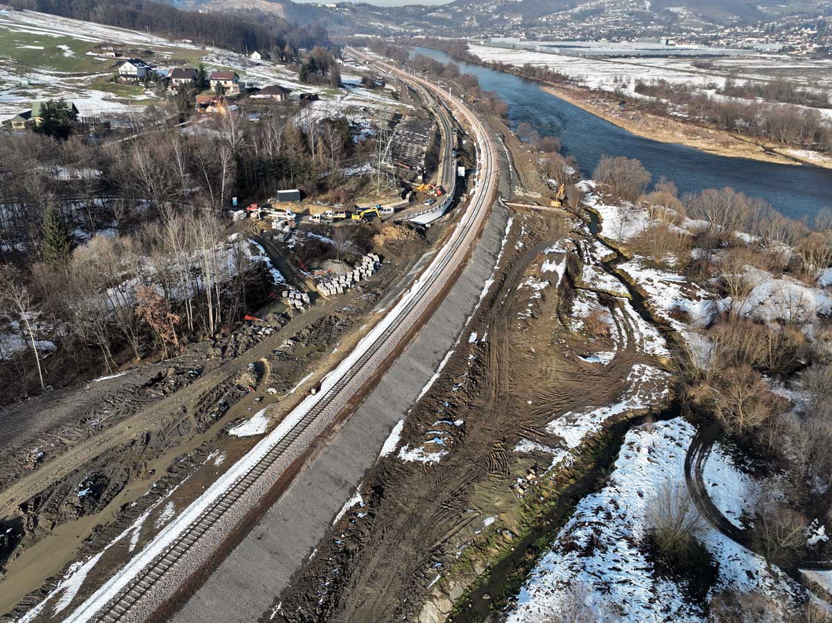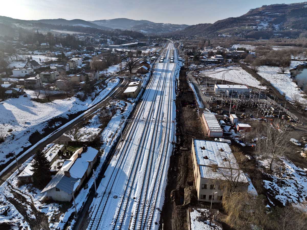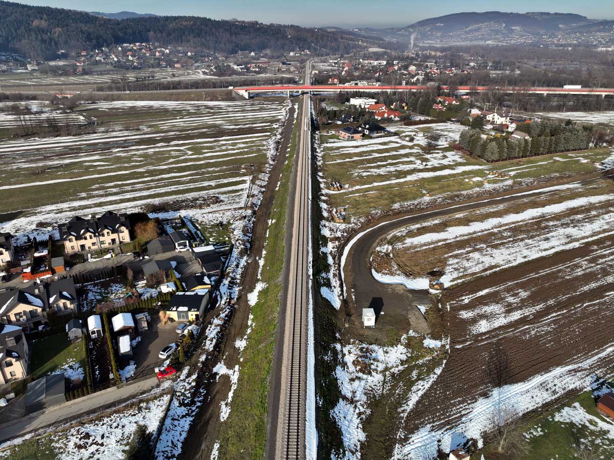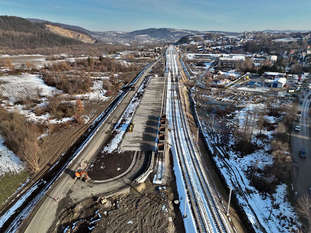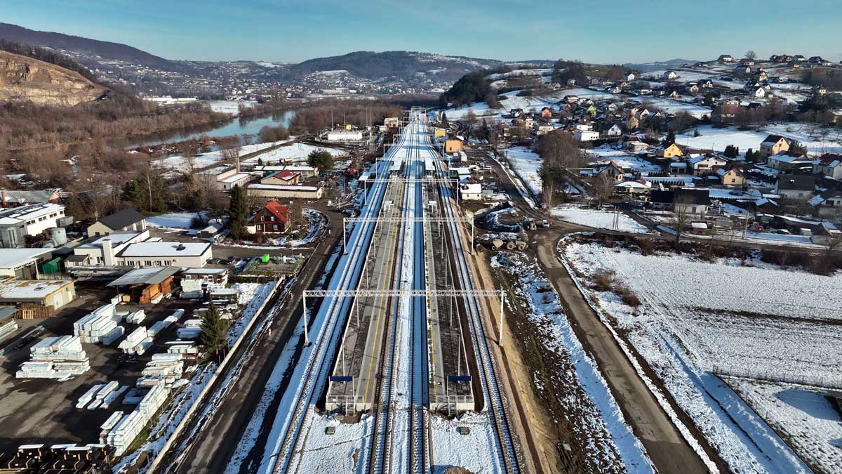 Nowe zdjęcia (z 4 grudnia) dokumentujące postęp prac modernizacyjnych na linii kolejowej między Nowym Sączem i Marcinkowicami (linia 104 do Chabówki a w przyszłości także do Krakowa). Na tym odcinku prowadzone od jesieni 2023 prace są już w fazie końcowej. Oprócz położonych nowych torów, wiaduktów i dużych prac w części drogowej zadania, teraz wykonywana jest elektryfikacja (nad torami pojawiła się już trakcja) oraz budowa Lokalnego Centrum Sterowania ruchem pociągów.
