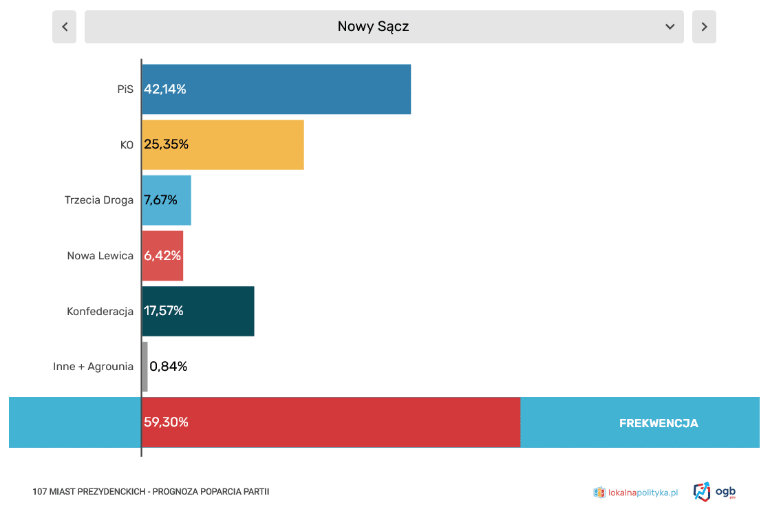 Serwis LokalnaPolityka.pl publikuje sierpniową prognozę poparcia partii politycznych w 107 miastach „prezydenckich”. Nowy Sącz jest na drugim miejscu wśród miast z najwyższym poparciem dla partii rządzącej.