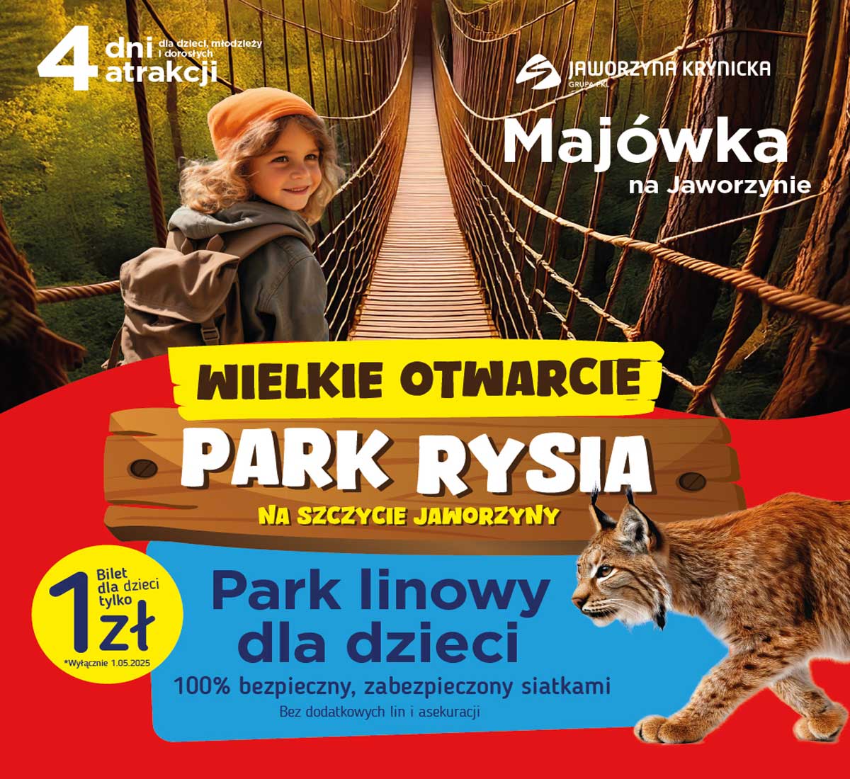 Wśród wydarzeń zaplanowanych od 1 do 4 maja znalazł się cykl imprez na Jaworzynie Krynickiej, związany m.in. z otwarciem na szczycie Jaworzyny nowego parku linowego Kraina Rysia. W programie animacje dla dzieci, warsztaty przyrodnicze, rodzinny rajd terenowy, wspólne grillowanie – szczegóły na stronie jaworzynakrynicka.pl