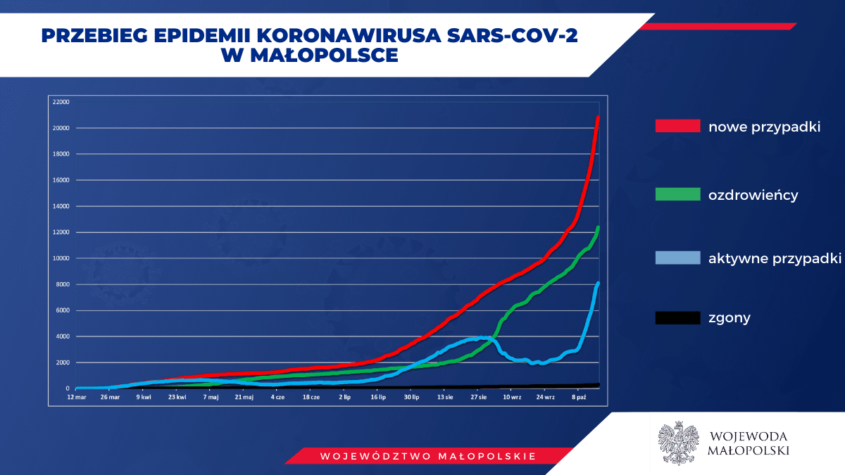 W ciągu ostatnich dziesięciu dniu w Małopolsce przybyło ponad 8 tys. nowych zakażonych. Od jutra niemal całe województwo będzie objęte czerwoną strefą. Nieustannie zwiększana jest liczba łóżek dla pacjentów z COVID-19. Podejmowane są też inne działania związane z zapewnieniem stabilności systemu opieki zdrowotnej.
