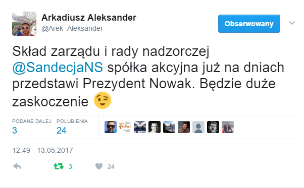 Niespodziankę związaną z personalną obsadą władz nowej spółki zapowiada Arkadiusz Aleksander, były piłkarz Sandecji, Doradca Prezydenta Miasta Nowego Sącza ds. Sportu oraz Pełnomocnik Zarządu MKS Sandecja ds. Sportowych. Na Twitterze obwieścił: „będzie duże zaskoczenie”.