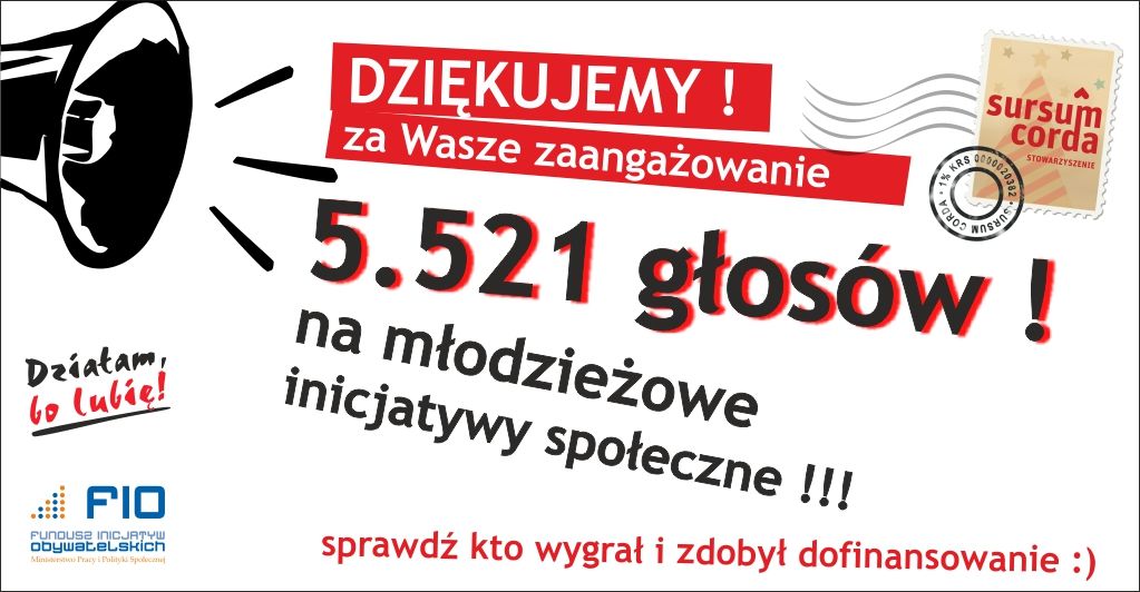 Stowarzyszenie Sursum Corda rozstrzygnęło właśnie konkurs dotacyjny dla nieformalnych grup młodzieżowych. Zakładaliśmy, że w pierwszej edycji zgromadzimy 500 głosów. Oddano 11 razy więcej! To pierwsza tego typu inicjatywa w regionie.