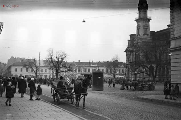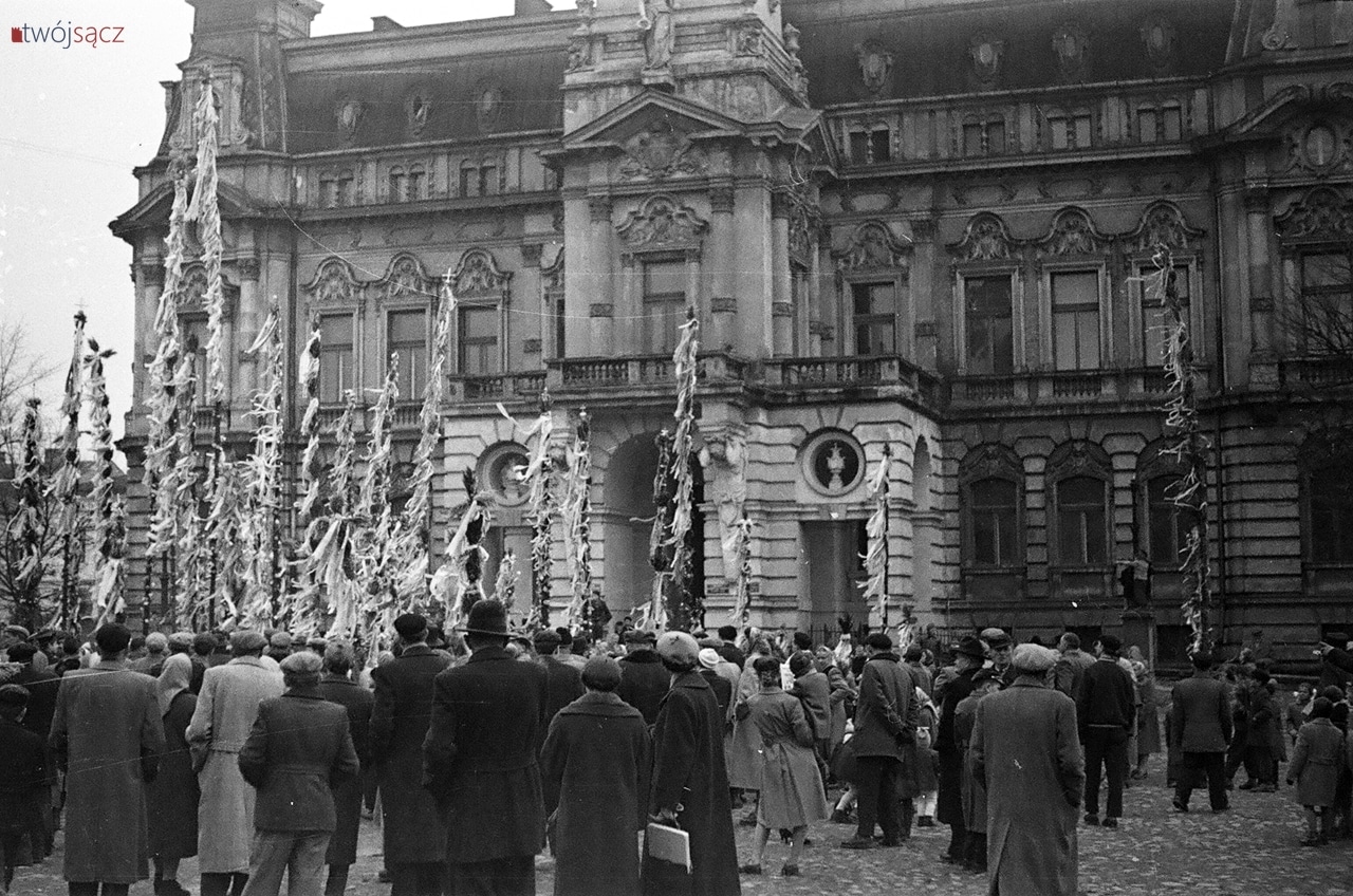 Na zdjęciach z 1958 roku pod ratuszem można dostrzec m.in. propagandową gablotę z nagłówkiem „Współzawodnictwo wzrostem dobrobytu” oraz prezentacją „Planu 5-letniego” (obejmował lata 1956 – 1960, uchwalono go w 1957 roku) i ze zdjęciami prawdopodobnie przodowników pracy. Na zdjęciach wcześniejszych o rok lub dwa gabloty już nie ma. Można także dostrzec na Rynku m.in. stację benzynową, kiosk „Ruchu” czy postój dorożek. Jedna z fotografii uwieczniła także przebudowę wieży Kolegiaty (remont odbywał się w latach 1955-59).
