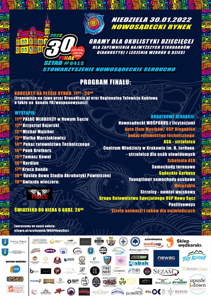 W niedzielę 30 stycznia 2022 także Nowy Sącz przyłącza się do 30. Finału Wielkiej Orkiestry Świątecznej Pomocy. Ponad 100 wolontariuszy będzie zbierać datki na ulicach miasta; przez cały dzień trwać będą koncerty, pokazy i licytacje. Tegoroczna zbiórka przebiega pod hasłem „Dla zapewnienia najwyższych standardów diagnostyki i leczenia wzroku u dzieci”.