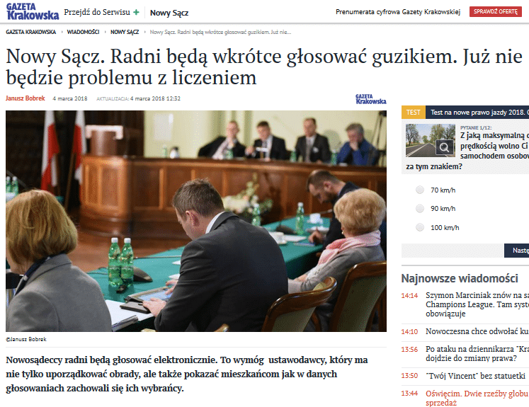 GAZETA KRAKOWSKA „Nowosądeccy radni będą głosować elektronicznie. To wymóg ustawodawcy, który ma nie tylko uporządkować obrady, ale także pokazać mieszkańcom jak w danych głosowaniach zachowali się ich wybrańcy”. http://www.gazetakrakowska.pl/wiadomosci/nowy-sacz/a/nowy-sacz-radni-beda-wkrotce-glosowac-guzikiem-juz-nie-bedzie-problemu-z-liczeniem,12978910/