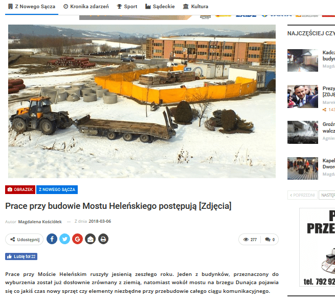 MIASTONS.PL „Prace przy Moście Heleńskim ruszyły jesienią zeszłego roku. Jeden z budynków, przeznaczony do wyburzenia został już dosłownie zrównany z ziemią, natomiast wokół mostu na brzegu Dunajca pojawia się co jakiś czas nowy sprzęt czy elementy niezbędne przy przebudowie całego ciągu komunikacyjnego”. http://miastons.pl/nowy-sacz/prace-przy-budowie-mostu-helenskiego-postepuja-zdjecia/
